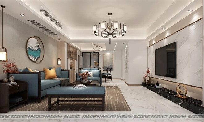 客廳優美而典雅,以現代簡約的仿大理石作為電視背景墻及地板瓷磚,營造空間整體感,攜以實木框架的布藝沙發、韻味別致的楓葉擺件、古樸的燈飾,端莊風雅的東方美與時尚前衛的現代風結于一室,造就靈韻萬千的畫面。
