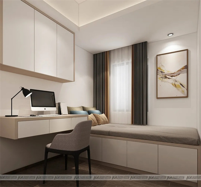 次臥的面積不大,設計師選用了衣柜書桌一體化功能設計,除了能夠節約空間,又滿足了工作、儲物等需求。