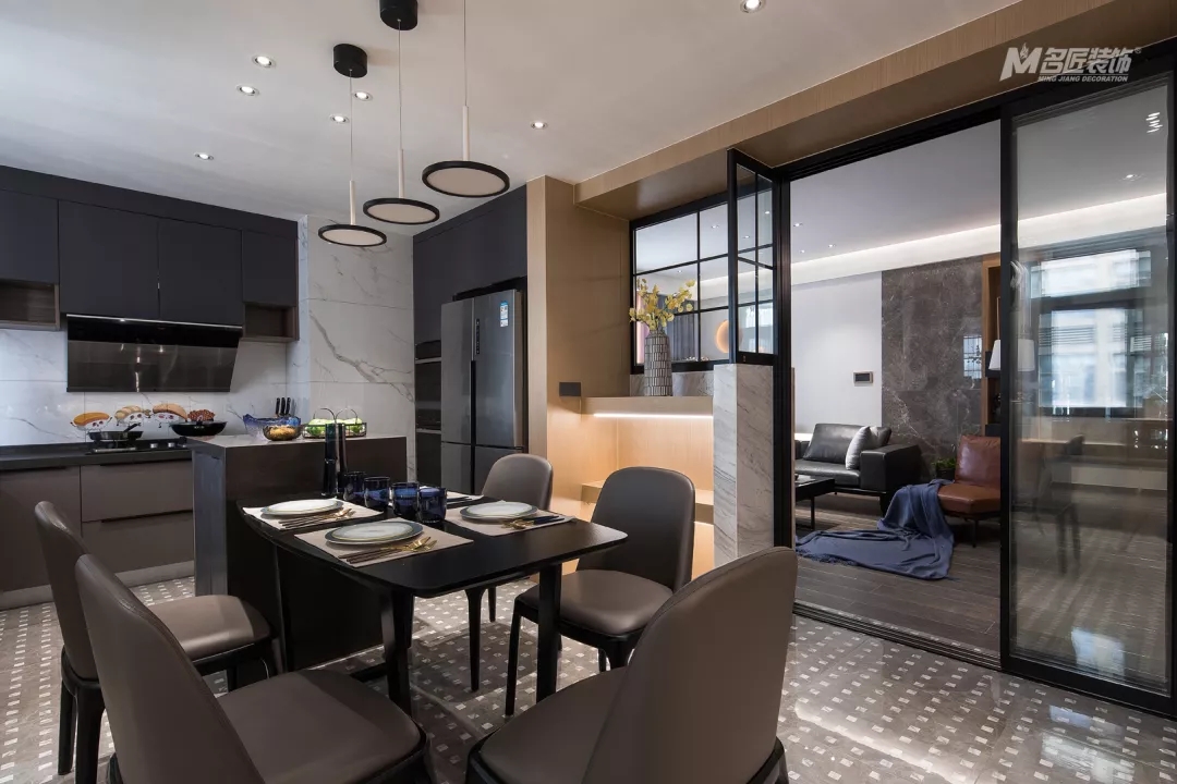 廚餐廳的另一端,墻面設計了木制隔板并裝飾了一些小物品,為烹飪、就餐時光增添了不少情趣。
