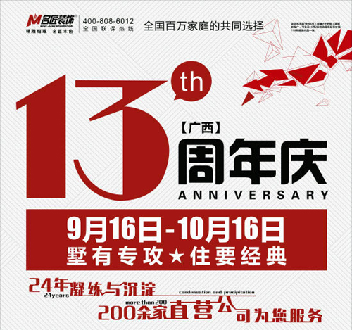 13年是一份又一份的堅守,13年是一次又一次的飛躍!名匠裝飾入駐廣西13周年,一路走過來,非常感謝新老客戶的支持與認可。2016年是名匠裝飾在廣西發展史上的一個新起點、新高度、新標準,開啟新的征程。在名匠裝飾入駐廣西13周年慶之際,“墅有專攻、住要經典”活動名匠裝飾梧州公司與一線品牌材料商強強聯手,答謝新老客戶,為廣大的客戶提供更為優質的裝修質量和服務。活動時間從9月16日——10月16日,為期一個月。