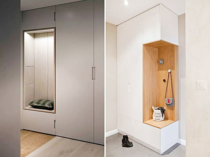 玄關(guān)放置了收納柜時(shí),可以將安裝在天花的筒射燈朝向柜面,柜子內(nèi)部則裝上led燈帶,減少照明死角,方便收納整理。