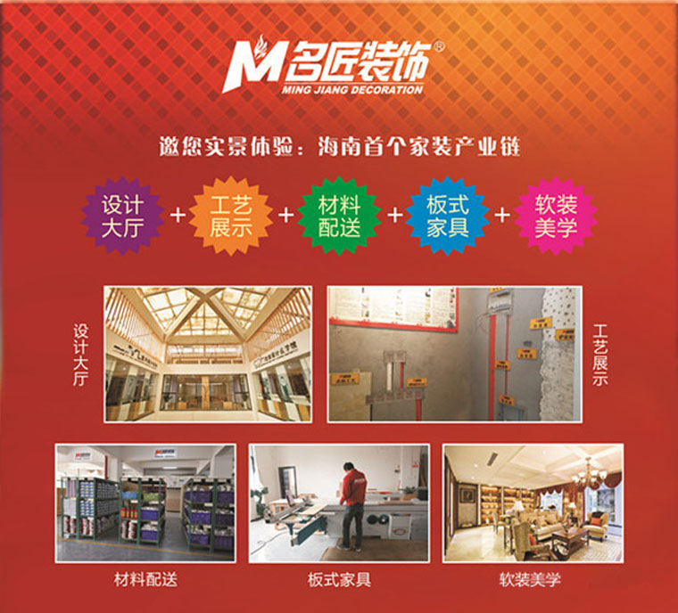 一握名匠手,永遠是朋友。名匠裝飾登陸海南以來,一直堅持“精雕細琢?名匠本色”,以精湛工藝為業主打造高品質家居,助業主得到方便、實惠,輕松筑家。精心、細致的感情,贏得了客戶的認可,真正與其結成朋友。歷經八載風雨歷程,現在的海南名匠已經豎起海南裝修行業新的標桿,在2014年相繼成立了材料配送中心、家具廠、設計二部、軟裝美學館,真正的打造出海南首家家裝產業鏈,令業主能夠明明白白裝修,讓裝修不再霧里看花!